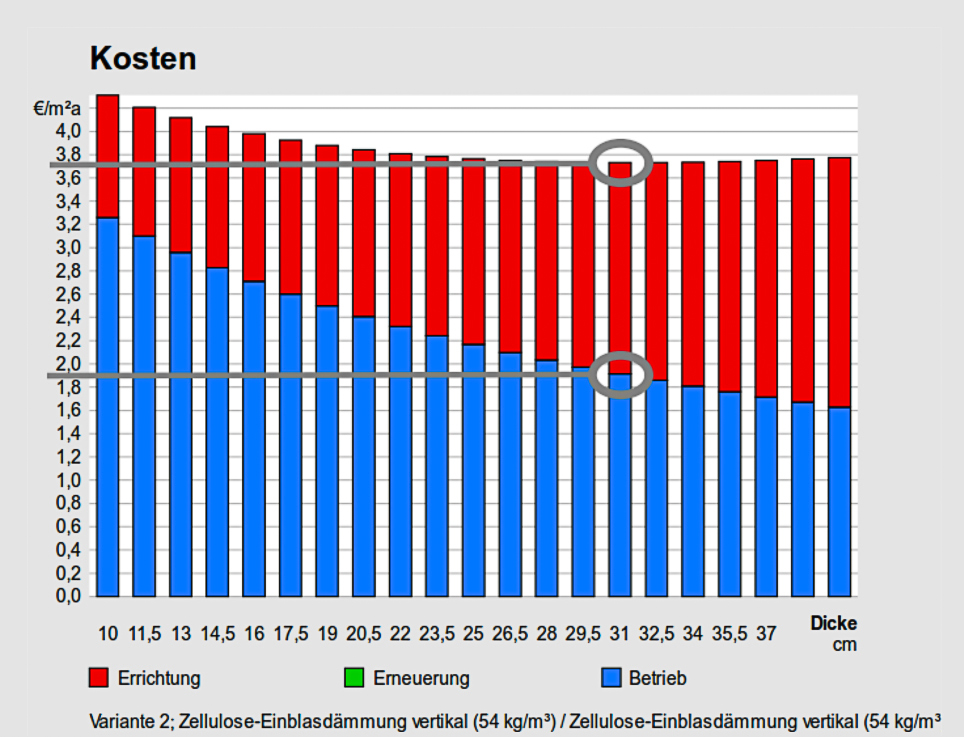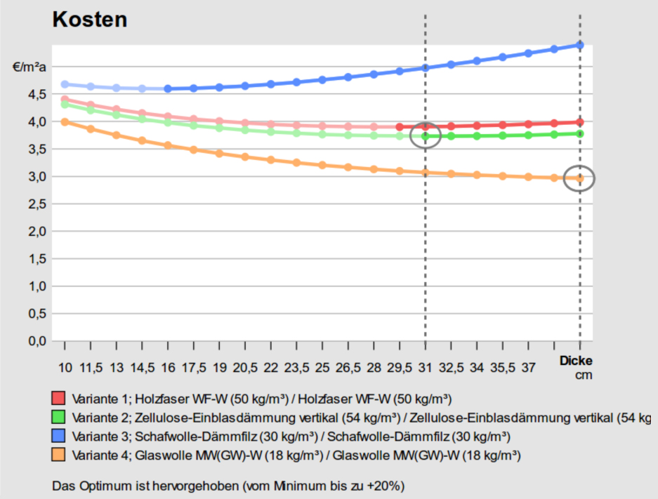Die Auswertung kann unter verschiedenen Gesichtspunkten geschehen, sich beispielsweise in einem ersten Schritt an den Kosten orientieren. Diesem Ansatz folgend wäre der kostengünstigste Dämmstoff mit seiner entsprechenden ökologisch optimalen Dicke auszuwählen, im vorliegenden Beispiel nach Abbildung 1 also eine 40 cm dicke Glaswolledämmung mit Kosten von ca. 3 EUR/m²a. Das nächstgünstigere Produkt ist Zelluloseeinblasdämmung mit Kosten von ca. 3,75 EUR/m²a bei einer ökolgisch optimalen Schichtdicke von 31 cm.