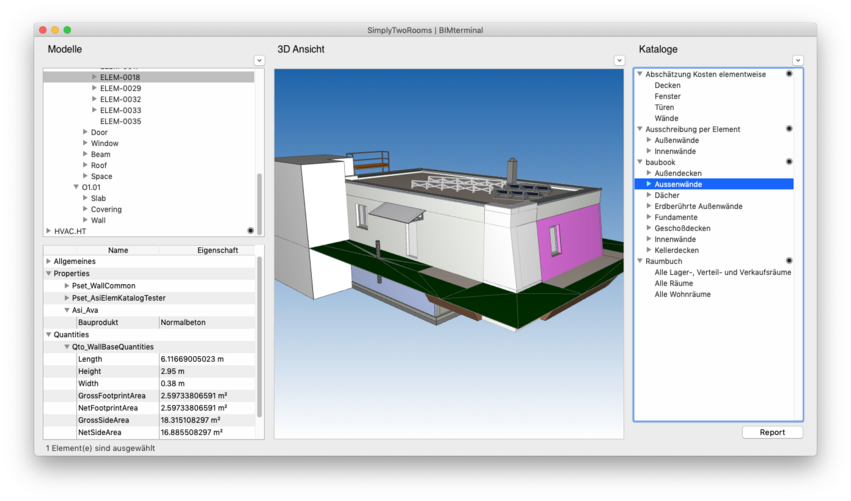 In das Programm werden zunächst Gebäudemodelle im offenen IFC4-Format[1] eingelesen und in einer 3D-Ansicht dargestellt. Such- und Filterfunktionen, verschiedene Ansichten und weitere Features ermöglichen, die Bauelemente genau zu untersuchen und auszuwählen. Mit Hilfe eines Kataloges an Bauelementen und gebäudetechnischen Anlagen werden die Kosten- und Nachhaltigkeitsdaten zugeordnet. Mit einem Klick auf „Report“ wird eine Auswertung des gesamten Gebäudes angezeigt.