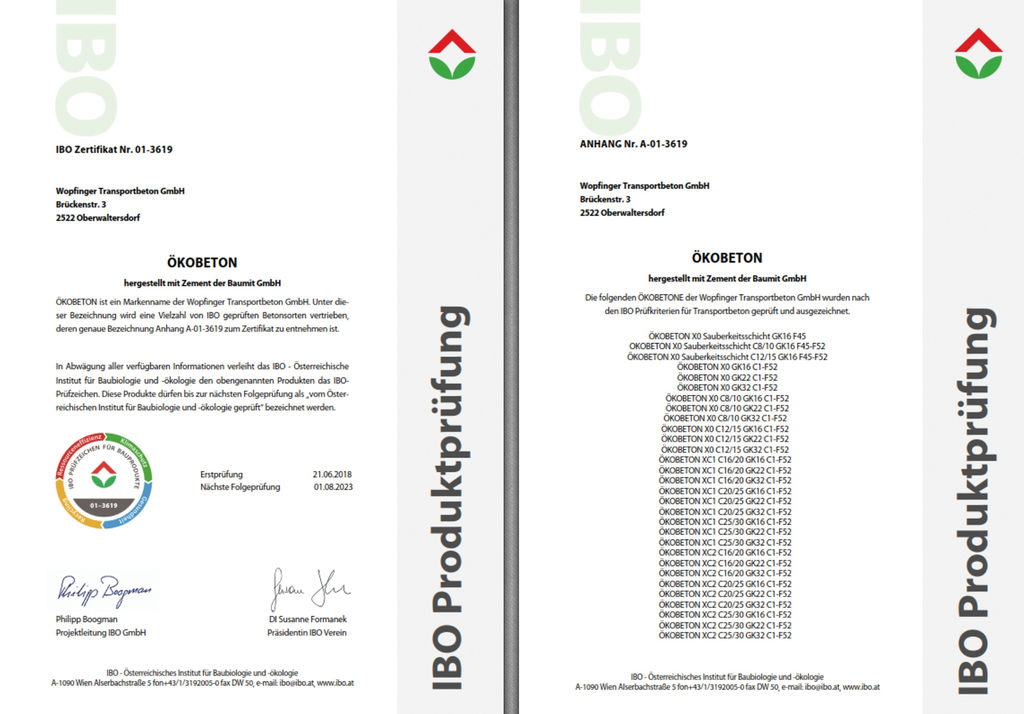 2018 wurden die ersten überarbeiteten Kriterien für die Produktgruppe „Transportbeton“ fertig gestellt und der Firma Wopfinger Transportbeton GmbH konnte für ihre Ökobetone das erste Zertifikat nach den Kriterien des neuen Prüfzeichens überreicht werden.