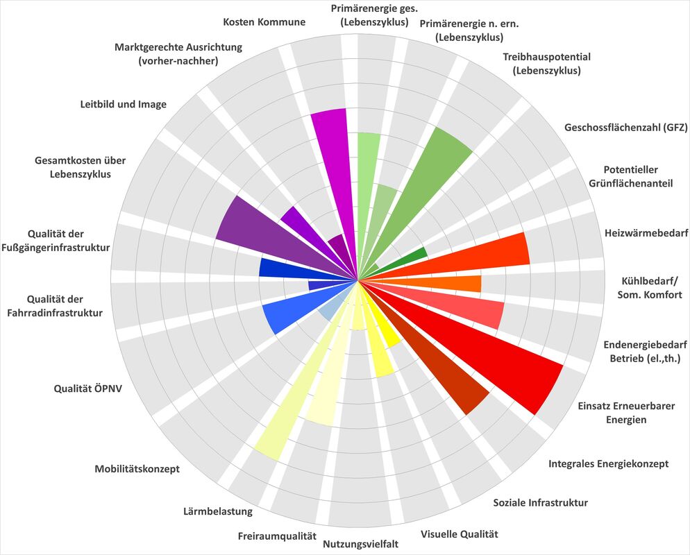Die Nutzung Erneuerbarer Energie wird im entwickelten Indikatorensystem im Schwerpunkt „Energie“ positiv gewertet, wirkt sich aber auch in den Kategorien „Umwelt“ und „Wirtschaft“ aus: Die Resultate der ökologischen und ökonomischen Lebenszyklusbetrachtung zeigen, dass die weitaus höchsten Aufwände bei der Betriebsenergie der Gebäude liegen und durch energieeffiziente Baustandards und erneuerbare Energie massive Einsparungen möglich sind. Welche architektonische Nachverdichtungsvariante gewählt wurde, fiel dagegen kaum ins Gewicht.