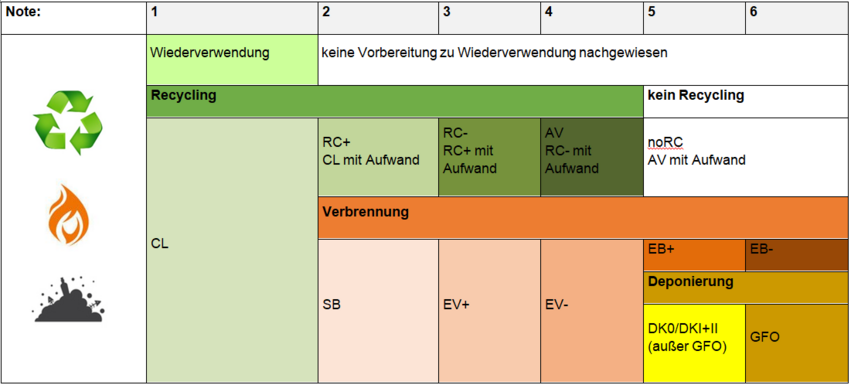Das deutsche Kreislaufwirtschaftsgesetz [7] schreibt eine eindeutige Hierarchie von Verwertungswegen vor, die in der Entscheidung für einen Entsorgungs- oder Verwertungsweg eingehalten werden muss. Oberste Priorität in dieser Hierarchie hat die Vermeidung von Abfall. Im Baubereich würde das bedeuten, ein Gebäude nicht zu bauen, weshalb diese Kategorie im vorliegenden Bewertungsschema nicht zum Tragen kommt. Ob gebaut wird oder nicht, muss an anderer Stelle entschieden werden. Die nächste Priorität hat die Wiederverwendung, dann kommen Recycling, energetische Verwertung und als letzte Stufe die Ablagerung auf einer Deponie. Das neue Bewertungsschema spiegelt diese Vorgabe wieder.