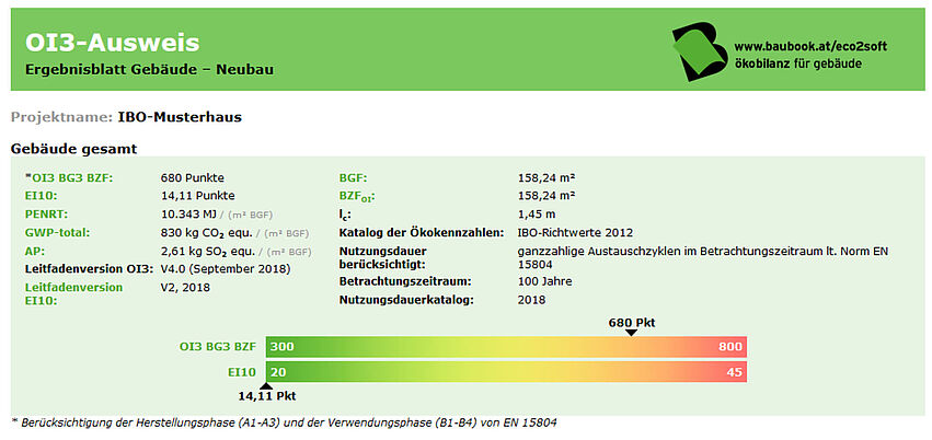 Bei der Auswertung werden die Inputs und Outputs aggregiert (zusammengezählt) oder es werden ihnen Wirkungen zugeordnet. Ergebnis sind Indikatoren wie zum Beispiel der Beitrag zur Klimaerwärmung (GWP) oder der Bedarf an nicht erneuerbaren Energieträgern. Hauptanwendungsgebiet im Baubereich ist die Ökobilanz von Gebäuden. Dafür werden Ökobilanzdaten von Bauprodukten verwendet. Diese werden meist über Umweltproduktdeklarationen (EPDs) in Form von pdf-Dokumenten veröffentlicht. In Österreich bietet die Bau-EPD GmbH die Erstellung von EPDs an. In der baubook-Datenbank werden die EPD-Daten digitalisiert und an Berechnungsprogramme für die Erstellung von Energieausweisen und Gebäudeökobilanzen weitergegeben. Allgemeine Grundlage für die Erstellung von EPDs im Baubereich ist die EN 15804.