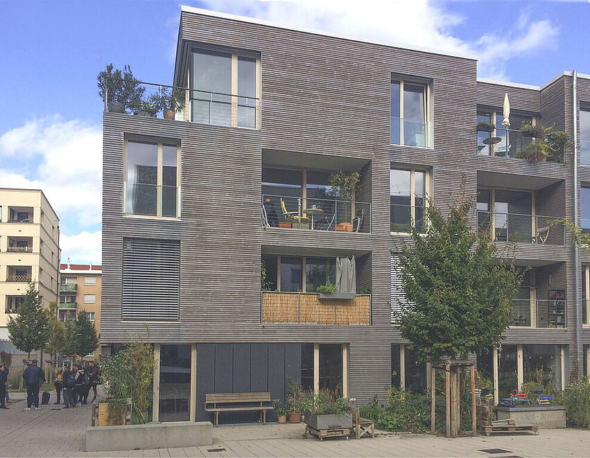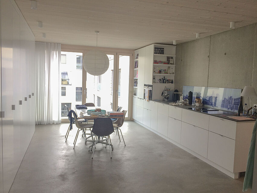 Einen Schritt weiter im Holzbau ging die Baugruppe MaxAcht in Stuttgart: das hier verbaute Holz ist komplett leimfrei und kann zerstörungsfrei rückgebaut werden. Der Stiegenhauskern wurde in Sichtbetonbauweise ausgeführt, Wände und Decken in den Wohnungen sind holzsichtig. Auf Bodenbelag wurde verzichtet, die Bewohner*innen konnten je nach Wunsch unterschiedliche Estrichbehandlungen auswählen. Die dadurch sichtbare Materialität besticht nicht nur durch ihre Klarheit, sondern ermöglicht eine einfache Trennung beim Rückbau des Gebäudes.