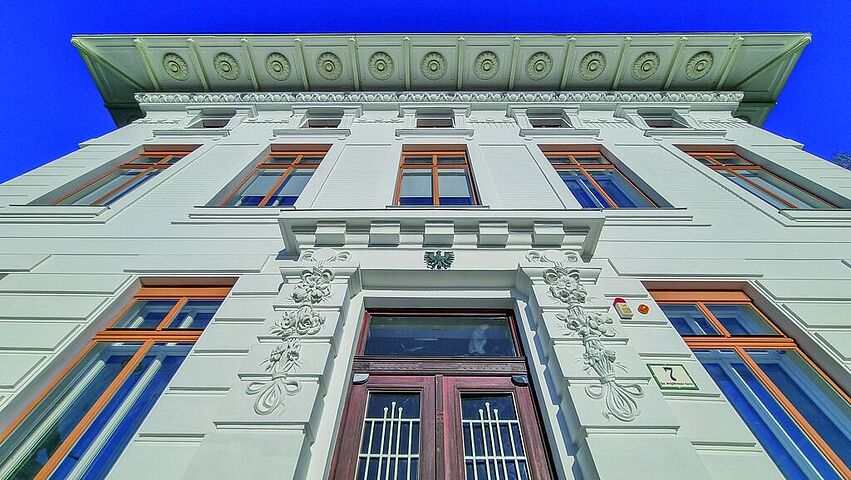 Das drei- bzw. viergeschoßige im Stil der Sezession errichtete Gebäude mit seinem markanten Dachaufsatz (Laterne) und dem weit auskragenden Dach steht unter Denkmalschutz. Der Eigentümer hat im Jahr 2016 in einer ersten Bauphase eine statische Sanierung bzw. Ertüchtigung des Gebäudes und eine Adaptierung der Büroräume durchgeführt.