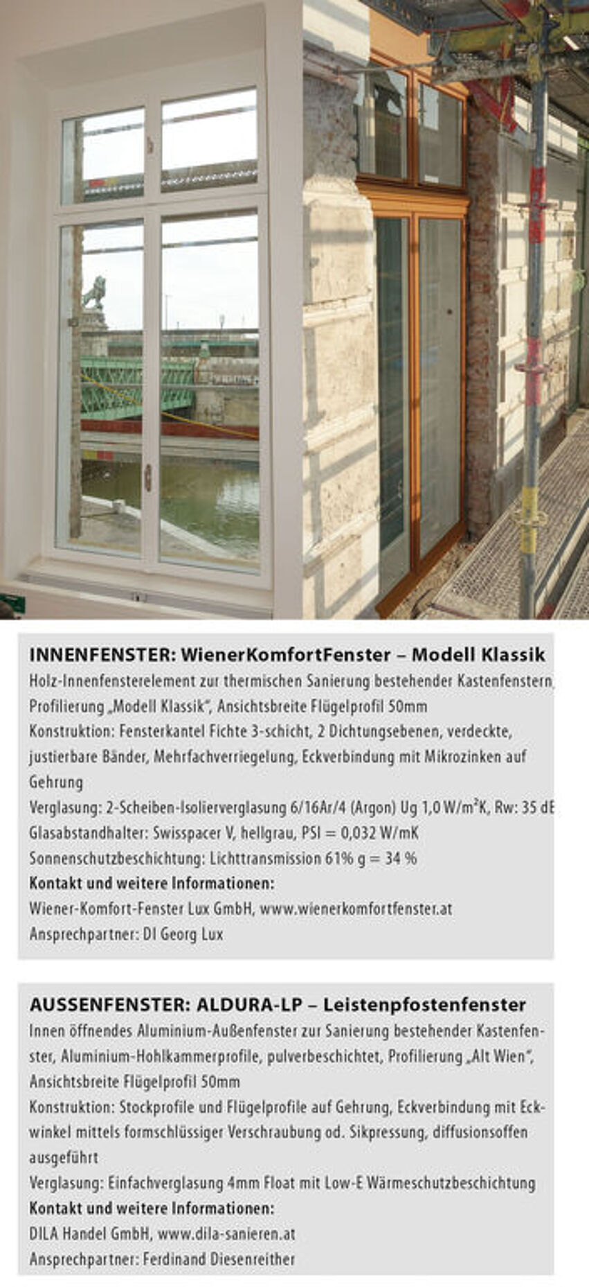 Die Besonderheit an diesem Standort ist, dass die Winddüse Leopoldsberg/Bisamberg den Regen mit bis zu 100 km/h an die Fassade und letztlich durch beide Fensterebenen treibt. Es wurde daher nach einer Lösung gesucht, die eine aufrechte Schlagregenprüfung vorweisen konnte. Als Lösung wurde das ALU-System Aldura der Firma DILA gefunden. Die in eigener Produktion gefertigten schlanken Profile wurden speziell für historische Kastenfenster entwickelt.