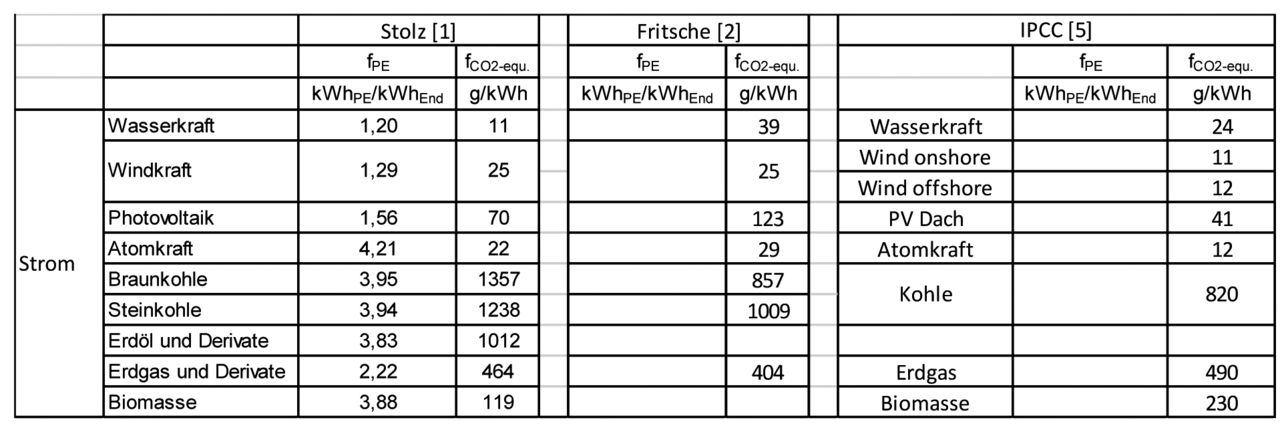 [1] Stolz, Frischknecht (2016:) Umweltkennwerte und Primärenergiefaktoren von Energiesystemen. treeze Ltd., fair life cycle thinking. Verfügbar unter: treeze.ch/fileadmin/user_upload/downloads/Publications/Case_Studies/Energy/563-Energiesysteme-v1.0.pdf (02.05.2017)
