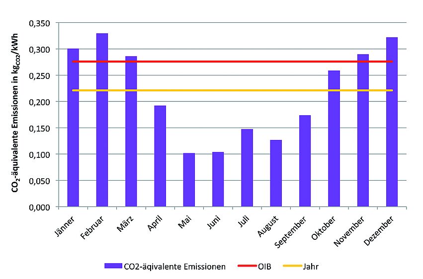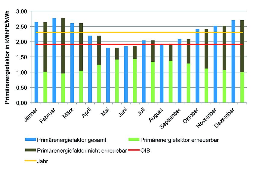Die nach der o.g. Methode bestimmten monatlichen Primärenergiefaktoren zeigen einen jahreszeitlich variablen Verlauf: während die Primärenergiefaktoren in den Monaten Mai bis September bei etwa 2 liegen, liegen sie von Oktober bis März bei Werten um 2,5. Der Jahresmittelwert liegt merklich höher, als der in der OIB RL 6 (2015) genannte Wert von 1,91.