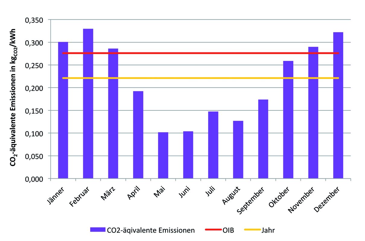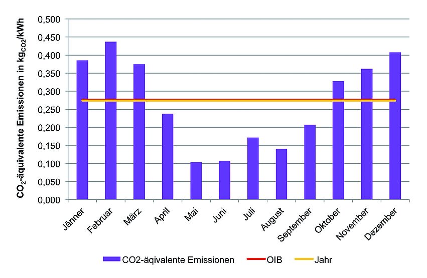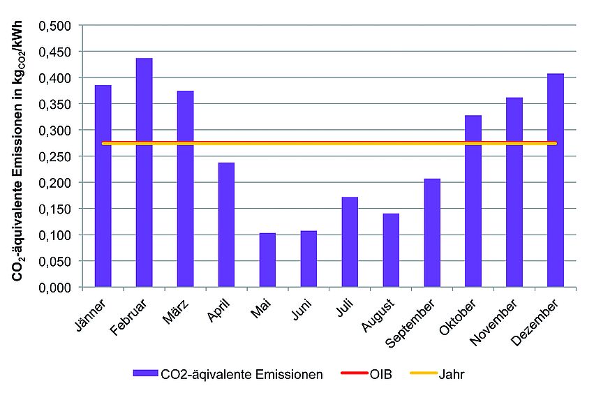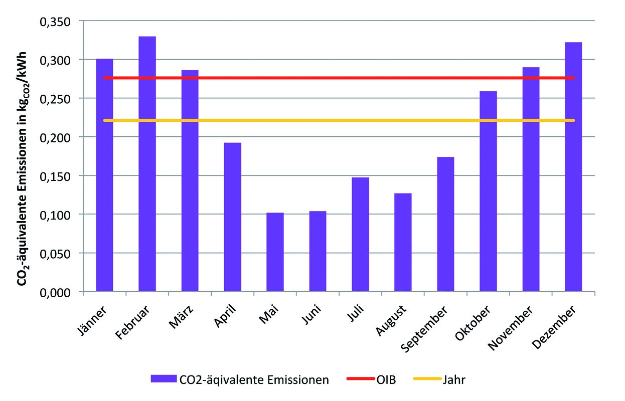Der jahreszeitliche Verlauf der CO2eq-Konversionsfaktoren ist deutlich ausgeprägter als der Verlauf der Primärenergiefaktoren. Die Monatsmittel schwanken zwischen ca. 100 g CO2eq/kWh im Mai und Juni und 437 g CO2eq/kWh im Februar. Der Jahresmittelwert entspricht sehr gut dem Jahreswert der OIB RL 6 (2015).