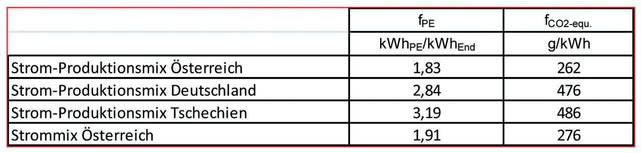Im Mittel der Jahre 2009 bis 2013 ergeben sich ein Primärenergiefaktor fPE für den österreichischen Verbraucherstrommix von 1,91 und ein Konversionsfaktor fCO2 von 276 g/kWhEnd.