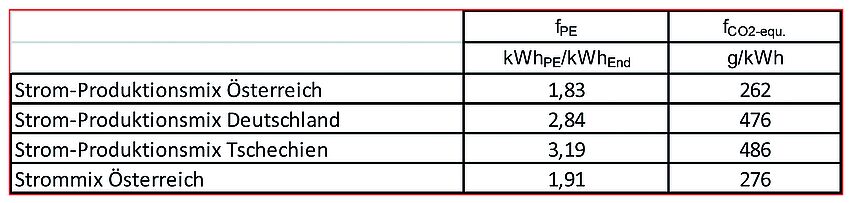 Die Primärenergiefaktoren und CO2eq-Konversionsfaktoren für den Verbraucherstrom-Mix eines Versorgungsgebietes können aus den Werten der einzelnen Kraftwerkstypen berechnet werden, wenn die Anteile der einzelnen Kraftwerkstypen an der Gesamterzeugung bekannt sind. Für die Berechnungen des Primärenergiebedarfs und der CO2-Emissionen im Energieausweis sind diese Werte in der OIB Richtlinie 6 (2015) bestimmt. Bei der Ermittlung wurden die Anteile der verschiedenen Kraftwerkstypen an der Stromerzeugung in Österreich sowie in den Hauptstromimportländern Deutschland und Tschechien berücksichtigt. Dabei wurde der jeweilige Stromerzeugungsmix im Mittel der Jahre 2009 bis 2013 zugrunde gelegt [6].