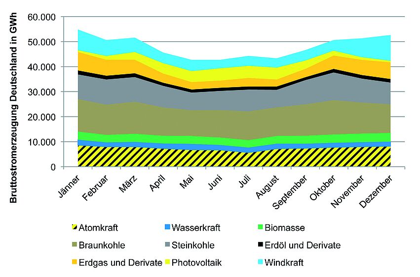 Aus dem monatlichen Inlandserzeugungsmix von Deutschland und der Tschechischen Republik ergaben sich monatliche Primärenergiefaktoren und CO2-äquivalente Emissionen für jedes der beiden Länder. Die folgende Abbildung zeigt beispielhaft die Bruttostromerzeugung Deutschlands.