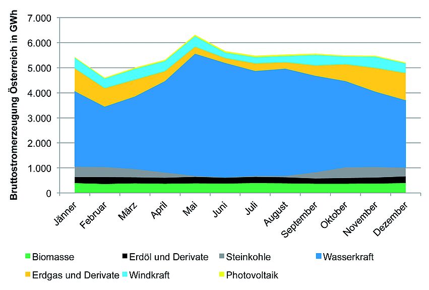 Als Basis für die Ermittlung der monatlichen Faktoren für Österreich wurden die Betriebsstatistiken der E-Control für die Jahre 2014 und 2015 verwendet, die in Form von Monatswerten vorliegen [7], [8]. Abbildung 6 veranschaulicht die monatliche Bruttostromerzeugung von Österreich im Mittel der Jahre 2014 und 2015. Sie verdeutlicht den ausgeprägten Jahresgang der Stromerzeugung aus Wasserkraft mit hoher Erzeugung im Sommer und deutlich niedrigeren Werten in den Wintermonaten. Ein noch stärker ausgeprägter Jahresgang mit Maximum im Sommer und weit niedrigeren Werten ergibt sich für PV-Strom. Wegen des noch sehr geringen Anteils an der Gesamterzeugung ist dieser Verlauf in der Abbildung kaum erkennbar.