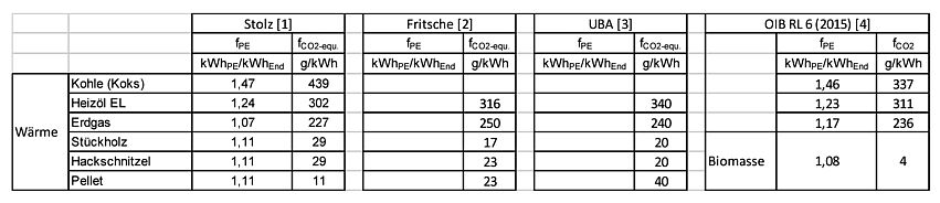 In der Abbildung 3 sind die Primärenergiefaktoren und CO2eq-Konversionsfaktoren der OIB Richtlinie 6 (2015) [4] für Brennstoffe den in drei wissenschaftlichen Studien [1], [2], [3] ermittelten Werten gegenübergestellt.