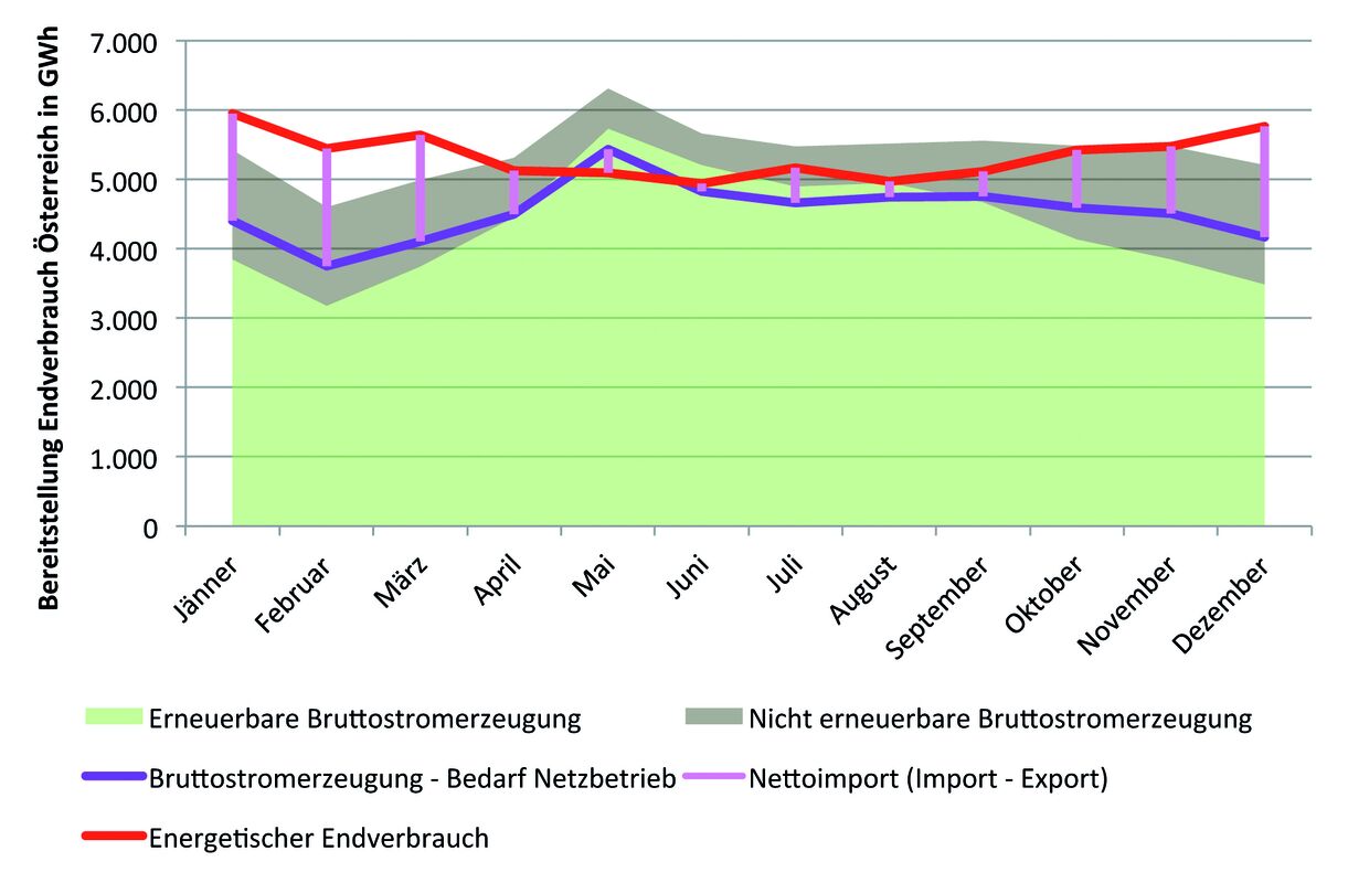 In der Abbildung 8 ist die Österreichische Bruttostromerzeugung aus regenerativen Energieträgern in Grün dargestellt, die aus nicht erneuerbaren Energieträgern in Grau. Die violette Linie zeigt die Österreichische Bruttostromerzeugung abzüglich des Bedarfs des Netzbetriebs, die rote Linie den Energetischen Endverbrauch Österreichs. Die Differenz zwischen violetter Linie und roter Linie beschreibt die Energiemenge, die Österreich importiert bzw. exportiert. Wie die Grafik veranschaulicht, ist die Import/Exportbilanz Österreichs besonders in den Wintermonaten negativ, es wird deutlich mehr Strom importiert als exportiert. Die Stromimporte Österreichs sind in den vergangenen Jahren kontinuierlich angestiegen.