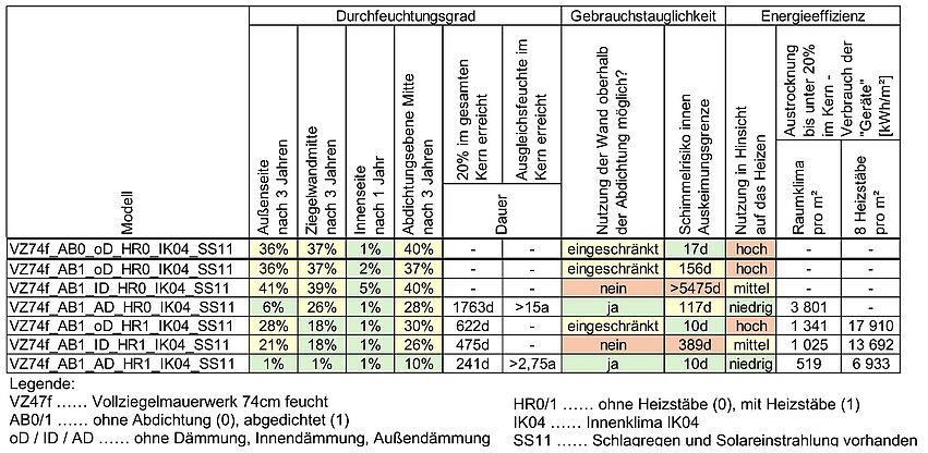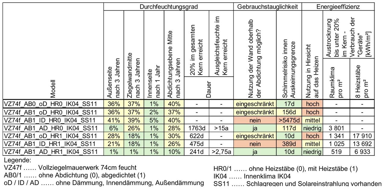 In der Auswertung ist erkennbar, dass lediglich vier der untersuchten Varianten den Zielwert von 20 % Wert erreichen und nur zwei davon weiter austrocknen können. Unter diesen vier Varianten befinden sich alle drei mit Heizstäben, auch die außen gedämmte ohne Heizstäbe.