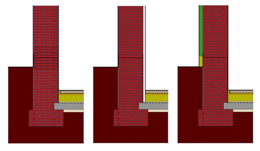 Vor Sanierungs- oder Trocknungsarbeiten ist die Feuchtebelastung und deren Verteilung im Mauerwerk zu bestimmen. Nur auf dieser Grundlage kann das geeignete Abdichtungsverfahren gewählt und später dessen Wirksamkeit überprüft werden. Falls eine Außendämmung möglich ist, sollte diese in Kombination mit einer nachträglichen Abdichtung bevorzugt werden. Eine entsprechend geschützte Außenwand erreicht nach etwa acht Monaten, bis zu einer Tiefe von 15 cm, einen Durchfeuchtungsgrad von 20 %. Unabhängig von der Bauweise des Sockels (bündig, vor- oder rückspringend) sollte der untere Abschluss zur Geländeoberfläche verschlossen und vor Wasser und Schmutz geschützt werden. Bei stark gegliederten Fassaden oder denkmalgeschützten Gebäuden kommt häufig eine Innendämmung zum Einsatz. Diese sollte jedoch nur nach vollständiger Trockenlegung der Wände angebracht werden. Um erneute Durchfeuchtung zu verhindern, sollte im Spritzwasserbereich ein geeigneter Putz verwendet werden, der auf die Eigenschaften des Mauerwerks abgestimmt ist. Bei Einsatz von Heizstäben empfiehlt es sich, den Putz vorab zu entfernen und die Poren des Mauerwerks durch Sandstrahlen zu öffnen, um das Austrocknungspotenzial zu erhöhen.