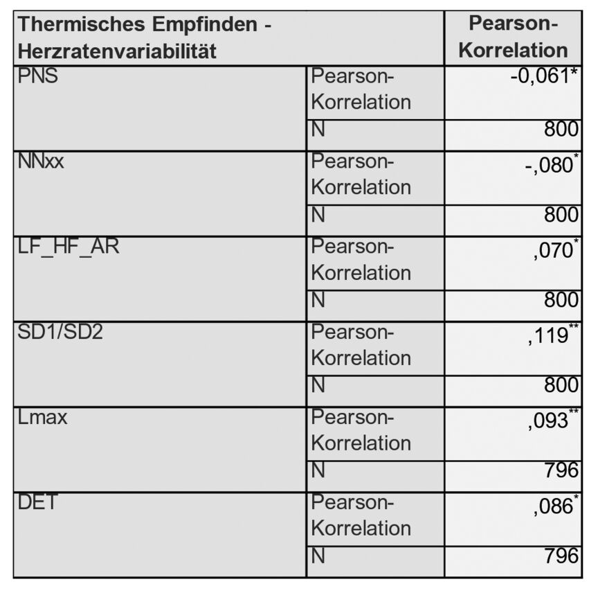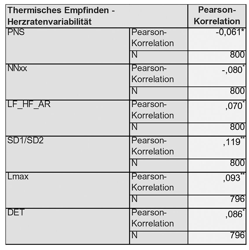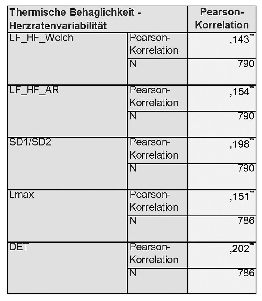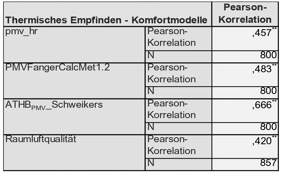 Berechnet man die statistischen Korrelationskoeffizienten (Pearson) zwischen den Votings der Versuchspersonen zu thermischer Behaglichkeit und den berechneten bzw. gemessenen Variablen, so ergibt sich eine Liste an signifikanten bzw. hochsignifikanten Korrelationen (siehe Tab. 3).
