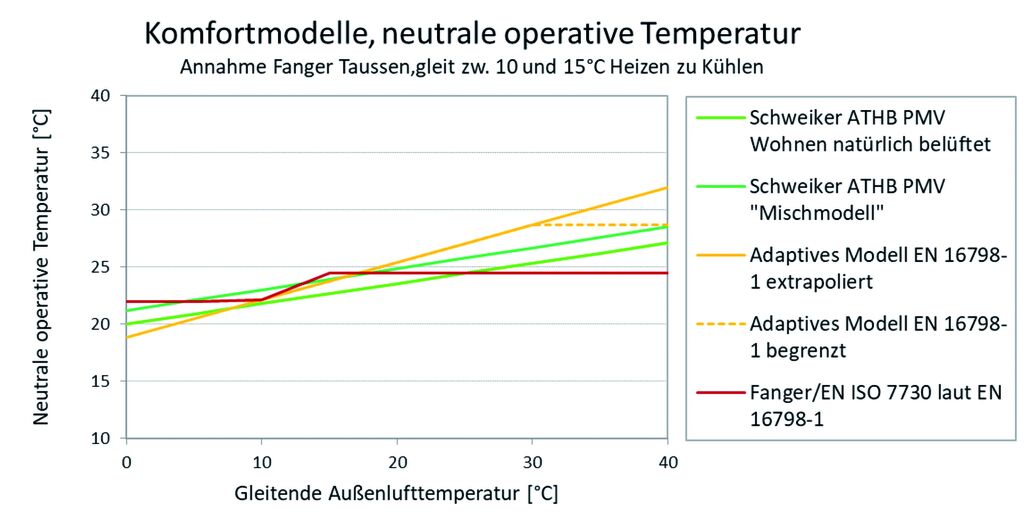 Die drei Modelle koexistieren, wobei Fangers Modell auf einem mechanistischen thermodynamischen Ansatz basiert und festgelegte Standards verwendet, während die adaptiven Modelle die Anpassungsfähigkeit und Individualität der Menschen betonen. Nach EN 16798-1 [DIN EN 16798-1] wird für klimatisierte Gebäude aktuell EN ISO 7730 [DIN EN ISO 7730] herangezogen. Für Gebäude ohne aktive Kühlanlage wird in einigen europäischen Ländern das adaptive Behaglichkeitsmodell verwendet. Es gibt jedoch auch unterschiedliche Ausprägungsformen dieses Modells, beispielsweise in Holland.