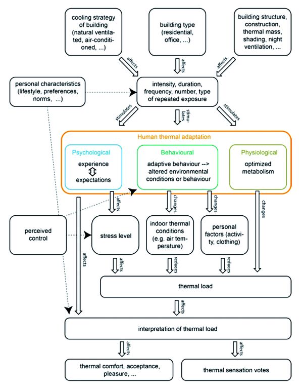 Gerade in der letzten Dekade wurde in den Definitionen von thermischem Komfort verstärkt die Wechselwirkung des Menschen mit der thermischen Umgebung sowie seiner Reaktion darauf betont. Statt statischer Konzepte, die vor allem aus der technischen Machbarkeit und der Dimensionierung von Klimaanlagen ausgingen, treten verstärkt interdependente Betrachtungsweisen in den Vordergrund, die nicht nur physikalische und physiologische, sondern auch psychologische und kulturelle Aspekte (z.B. „Erwartungshaltungen“), also die Reaktionen von Menschen, berücksichtigen.