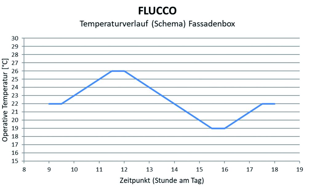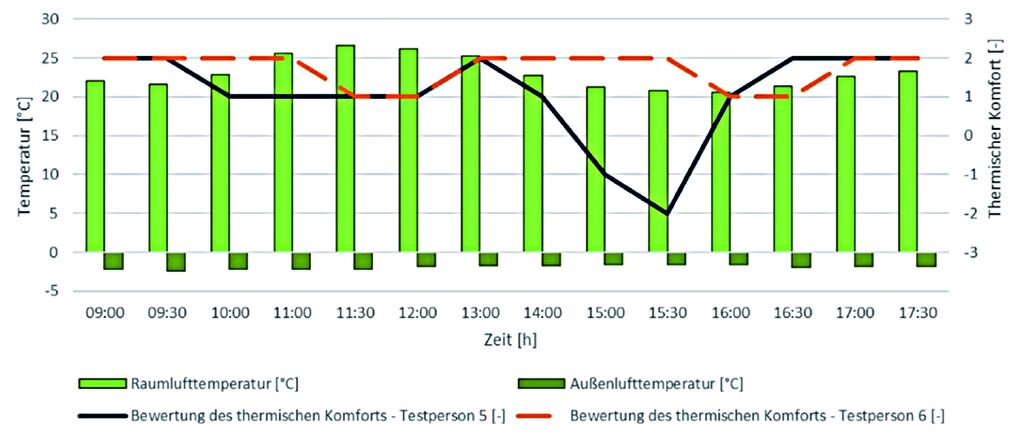 Für FLUCCO+ wurde vorab ein Temperaturszenario festgelegt, das die normativ festgelegten Komfortgrenzen über- bzw. unterschreitet (Abbildung 6). Nach einer halbstündigen Phase der Akklimatisierung bei 22 °C zu Beginn der Untersuchung stieg die operative Temperatur rasch auf 27 °C. Danach erfolgte eine Abkühlphase auf 20,5 °C und eine weitere Aufheizphase auf 23 °C.