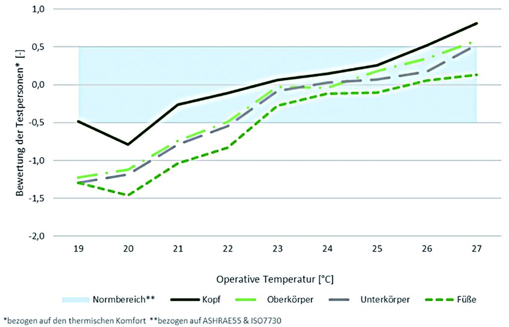 Berücksichtigt man die unterschiedlichen Körperregionen, Kopf, Oberkörper, Unterkörper, Füße im Verhältnis zur Norm ASHRAE 55 sowie der Norm ISO 7730 [DIN EN ISO 7730], ergibt sich, dass alle Empfindungen an den verschiedenen Körperregionen einen ähnlichen Verlauf aufweisen, doch der Toleranzbereich am Kopf ist größer. Die Bewertung des thermischen Komforts am Kopf unterscheidet sich erwartungsgemäß von der subjektiven Bewertung an den Füßen, bei denen eine neutrale Bewertung erst bei über 25°C eintrat. Generell stimmt der thermische Komfort annähernd mit den als „neutral“ bewerteten Temperaturbereichen von etwa 20°C bis 22 °C überein. Statistisch signifikant ist dabei die operative Temperatur, also die empfundene Temperatur, die als arithmetisches Mittel aus der Lufttemperatur und der mittleren Temperatur der Umschließungsflächen berechnet wird.