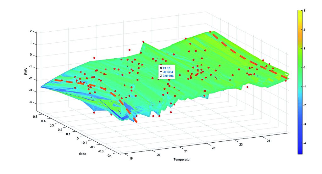 Die Votings aus der ACR-Prüfbox wurden benutzt, um den Zusammenhang zwischen dem PMV-Voting, der Temperatur und der Temperaturdifferenz herauszuarbeiten. In der Literatur [Vellei2020] gibt es Hinweise, dass die Votings besser werden, wenn nur die Temperaturänderung in die richtige Richtung geht, dh. bei niedrigen Temperaturen werden schon positivere Votings abgegeben, wenn die Temperatur steigt und bei zu hohen Temperaturen ist es umgekehrt.