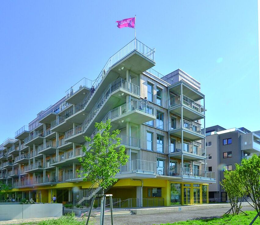Sowohl ÖGNB- als auch klimaaktiv-zertifiziert ist das Baugruppenprojekt Gleis 21 in Wien 10. Geplant wurde das Wohngebäude von dem Büro einszueins architektur, das sich auf Baugruppen, Partizipation und kooperative Stadtplanung spezialisiert hat und schon einige derartige Projekte realisieren konnte. Was Gleis 21 besonders auszeichnet, sind die modulare Gestaltung der Grundrisse, die eine hohe Flexibilität und damit Anpassung an familiäre Elastizität erlaubt und die gemeinschaftlich gestalteten und nutzbaren Erd- und Dachgeschoßzonen, die teilweise allen Bewoh-ner*innen des Quartiers zur Verfügung stehen. Sehr gut punkten konnte das Gebäude auch durch die Materialwahl: die Decken sind in Hybridbauweise aus Beton und KLH ausgeführt, die Außenwände wurden aus vorgefertigten Holzkastenelementen, die Wohnungstrennwände aus KLH hergestellt. Durch die frühe Einbindung der künftigen Bewohner*innen konnten vom Architektenteam Lösungen entwickelt werden, die sowohl den Vorstellungen der jeweiligen Nutzer*innen entsprachen, als auch genug Offenheit für spätere Nutzung durch andere Bewohner*innen zulassen.