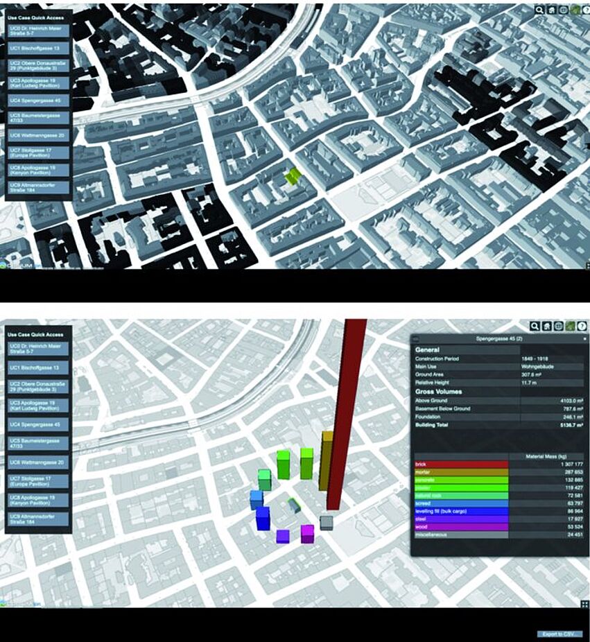 Über Gebäudenutzung, Objektgröße und Bauperiode der Gebäudeerrichtung wurden die ausgewerteten Materialien mit einer bestehenden Geoinformationssystem (GIS)-Datenbank verbunden. Dadurch wurde eine Hochskalierung und somit eine Prognose der verbauten Materialmassen für relevante Quartiere ermöglicht. Im Wesentlichen konnte damit ein gesamtheitliches Framework für die Gebäudeaufnahme im Bestand bis hin zur Hochskalierung von Materialmassen auf Stadtebene erstellt werden.