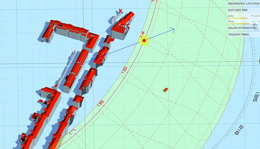 Zunächst wurde der Sonnenverlauf mit einem animierbaren 3D Modell nachgestellt um für die Projektbeteiligten eine Diskussionsgrundlage zu schaffen und die Problemstellung zu veranschaulichen. In den Sommermonaten kommt es bereits in den frühen Morgenstunden zu einem hohen solaren Eintrag, der aufgrund fehlender automatisierter Beschattung unzureichend abgefangen wird. Das IBO hat im Innenraum an 7 Positionen Sensorik zur Überwachung der Raumlufttemperatur und -feuchtigkeit installiert. Zusätzlich wird der Stromverbrauch der Klimaanlage erfasst. Um den Einfluss der hohen inneren thermischen Lasten auszuschalten, wurde zusätzlich ein thermodynamisches Simulationsmodell erstellt. Damit und mit den von der BOKU erfassten Messdaten zur Transmissivität wird die Wirkung mit und ohne Begrünung errechnet.
