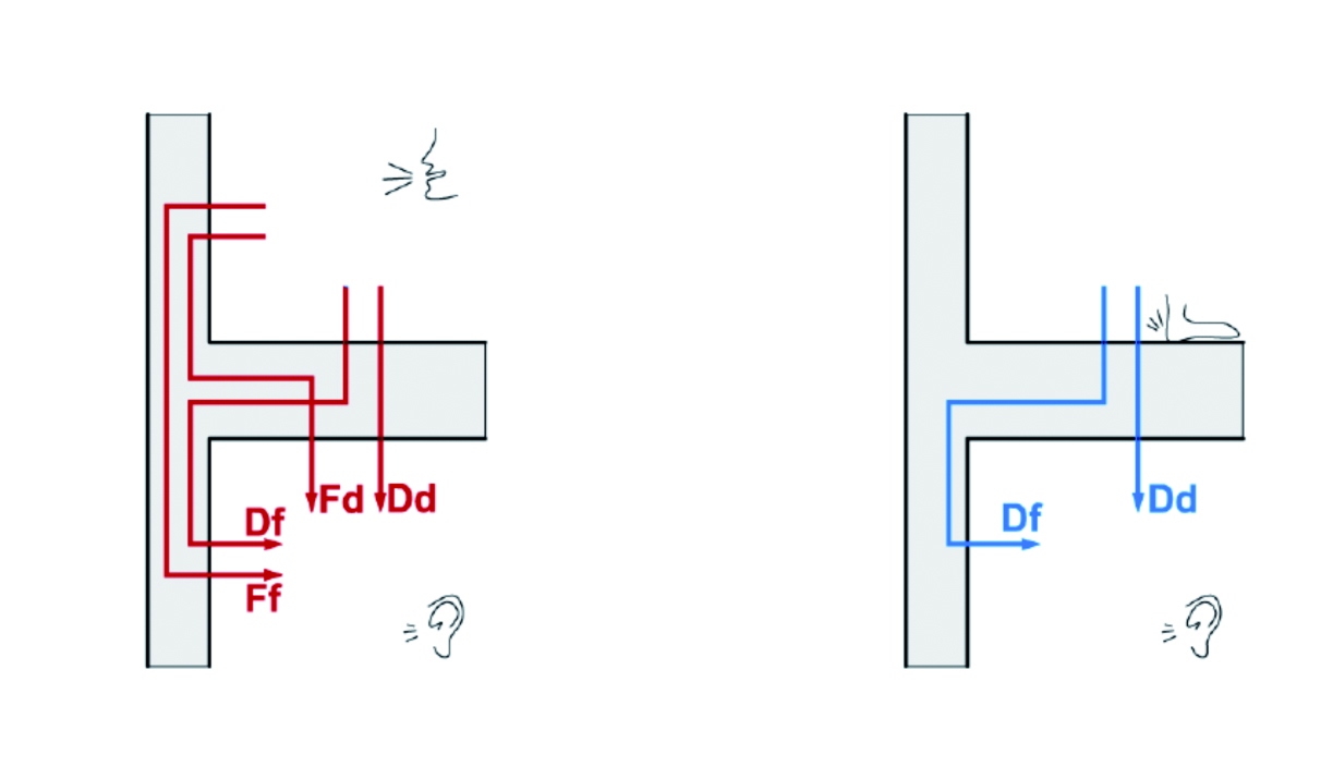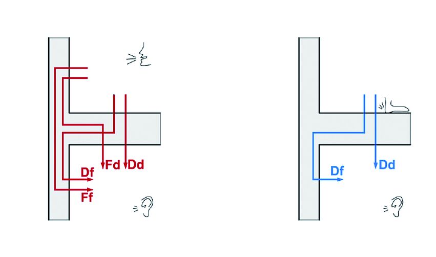 Die Schallübertragung zwischen Räumen in Gebäuden erfolgt über den Trennbauteil (Dd) und über die Flanken (Df, Ff, Fd) (Abbildung 3). Im mineralischen Massivbau (im Mehrgeschosser üblicher Weise Beton) wird die Flankenübertragung pauschal mit 3 dB berücksichtigt, was erfahrungsgemäß der Praxis entspricht. Der Massivholzbau weist je nach Konstruktion sehr unterschiedliche Flankendämmungen auf. So führen beispielsweise abgehängte Decken zu akustischer Dominanz der Flanken, sofern keine Vorsatzschalen an den Wänden angebracht werden. Eine Berücksichtigung und detaillierte Betrachtung der Stoßstellen bei der Planung, inklusive erforderlicher Maßnahmen wie die Anordnung von elastischen Zwischenlagen, ist daher erforderlich. Gemäß der normativen Prognosemethode der Schalldämmung zwischen Räumen in Gebäuden der Serie ÖNORM EN ISO 12354 wird u.a. deshalb auch in die Übertragungswege (direkt und indirekt) unterschieden.