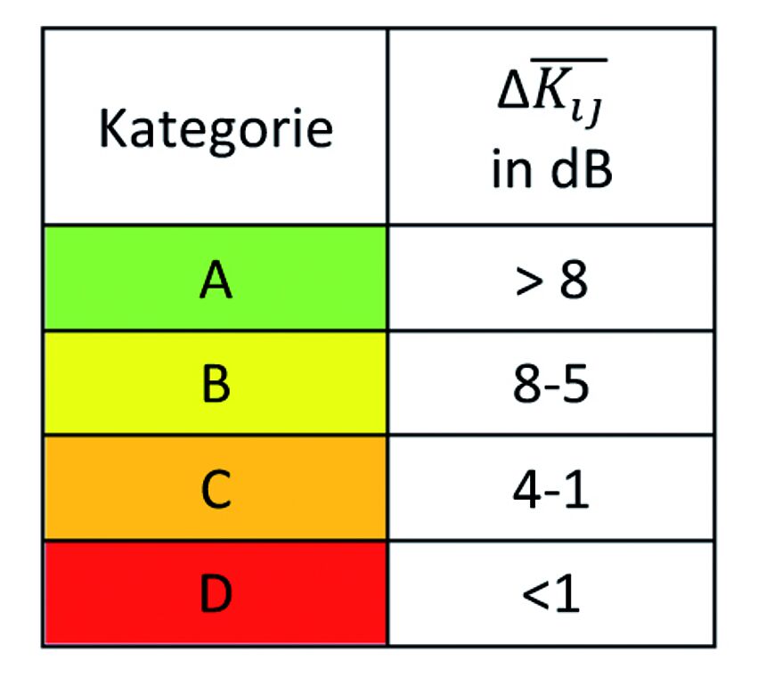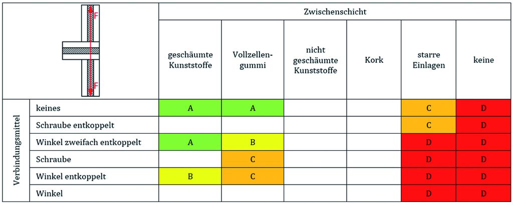 Um die breite Anwendung einer Prognosemethode zu gewährleisten ist eine einfache Anwendbarkeit Voraussetzung, die jedoch nicht die Zuverlässigkeit beeinträchtigen darf. Aus diesem Grund wurde eine Kategorisierung eingeführt, welche die Verbesserung des Stoßstellendämm-Maßes durch die Anwendung von Zwischenschichten und Verbindungsmitteln im Bauteilstoß charakterisiert und eine etwaige Verbesserung oder Verschlechterung gegenüber dem starren Stoß darstellt (Tabelle 1). Generell ist zu berücksichtigen, dass elastische Zwischenschichten (vulgo Baulager) das Stoßstellendämm-Maß verbessern (und damit die Flankenübertragung verringern) und die statisch erforderlichen Befestigungsmittel dieses wieder reduzieren. Eine sinnvolle Auswahl und Abstimmung zwischen beiden Maßnahmen ist daher erforderlich.