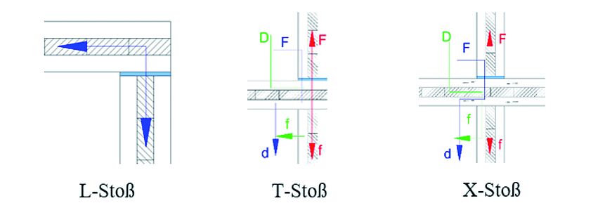Für die Prognose und Wirksamkeit von elastischen Zwischenlagen kommt es auch auf die konstruktive Ausführung der Stoßstelle an. Dabei wird grundsätzlich zwischen L-, T- und X-Stoß unterschieden (Abbildung 4). Für den T- und X-Stoß können mehrere Pfade die akustische Übertragung beeinflussen. Es gilt also zunächst zu klären, welche „Stoßart“ zu berücksichtigen ist.