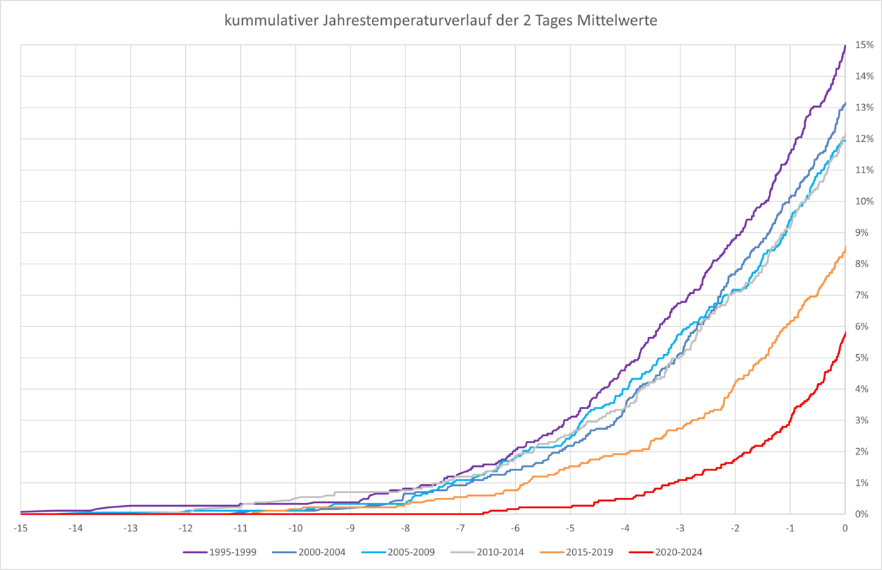 Zur Illustration wurde die kumulative Verteilung der 2-Tagesmitteltemperaturen über alle 30 Standorte gemittelt (Abb. 2). Die letzten beiden 5-Jahressegmente weisen eine deutliche Verschiebung hin zu höheren Temperaturen im Bereich der Minusgrade auf.