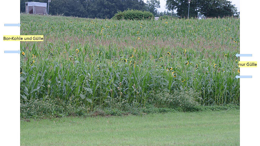 Die Sonnenerde - Gerald Dunst Kulturerden GmbH in Riedlingsdorf (Bgld) führte die Verkohlung der Pellets durch. Schnell wurde erkannt: Die reinen Dämmstoffpellets eignen sich noch nicht zum Verkohlen, weil die Energiedichte zu niedrig ist. Getreidespelzen werden seither beigemischt. Der Mindestgehalt von 0,01 % Bor, der für den Einsatz von Düngemitteln vorgeschrieben ist, wurde ohne Probleme erzielt. Die anwendungsorientierten Feldversuche zur Nutzung als Spurenelementdünger für Silomais, Sonnenblumen und Raps. zeigten eine vielversprechende Düngewirkung (Abbildung 2). Die Elementaranalyse wies in den borgedüngten Pflanzen außerdem ein bedeutend höherer Anteil am Spurenelement Mangan nach – Mangan erfüllt wichtige Funktionen bei der Photosyntheseleistung der Pflanzen.