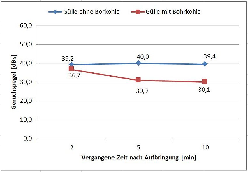 Bei den Feldversuchen fanden sich außerdem Hinweise darauf, dass mit Borkohle versetzte Gülle weniger Gerüche abgibt als die Gülle ohne Zusätze. Wiederholte Messungen mit dem Olfaktometer bestätigten diese Erstindikation: Die Geruchskonzentration reduzierte sich durch die Zudosierung von praxistauglichen Mengen an Kohle zur Gülle um bis zu 85 % (Hampejs 2018). Dies entspricht einer Verminderung des Geruchspegels um bis zu 8 dBGeruch. Die Einwirkdauer hat einen signifikanten Einfluss auf die Geruchsreduktion wie in Abbildung 3 zu sehen ist. Bereits ausgehend von einem geringeren Ausgangswert sinkt der Geruchspegel der mit Borkohle versetzten Gülle offenbar schnell ab (Hampejs 2018). Erklärt werden kann die Fähigkeit der Borkohle, unangenehme Gerüche in der Gülle zu binden, durch die hohe spezifische Oberfläche von ca. 180 m2/g.
