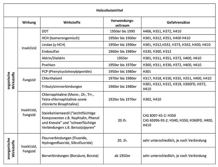 In den 1950er bis 1980er Jahren wurden in erster Linie lösemittelhaltige Holzschutzmittel zur Nachbehandlung von Holzbauteilen im Bestand bzw. im Rahmen von Bekämpfungs- oder Sanierungsmaßnahmen eingesetzt. Diese Produkte enthalten als Wirkstoffe in den meisten Fällen die zu den Organchlor-Verbindungen zählenden Substanzen Chlornaphthaline, DDT, Lindan und PCP (Pentachlorphenol). In Einzelfällen konnten diese zusätzlich PCB’s und/oder PCT’s (polychlorierte Biphenyle bzw. Terphenyle) enthalten. Eine Übersicht über Wirkstoffe und davon ausgehende mögliche Risiken gibt Tabelle 1.