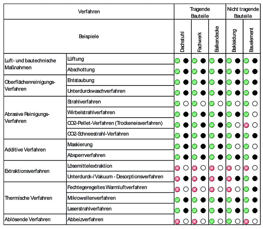 Gebäudeeigentümern und -nutzern sowie mit der Erhaltung und Bewahrung von Kunst- und Kulturgut betrauten Behörden und Einzelpersonen wird mit dem Merkblatt eine Arbeitsgrundlage zur Feststellung und Bewertung einer Kontamination sowie ein Überblick zu gegenwärtig vorhandenen oder in Entwicklung befindlichen Verfahren zur Dekontamination von Holzschutzmittel-belasteten Objekten gegeben. Der Schwerpunkt liegt dabei auf der Darstellung der Möglichkeiten und Grenzen einzelner Reinigungs- und Sanierungsverfahren, ihrer Eignung für bestimmte Anwendungsfälle (Tabelle 2) und die beim Einsatz der Verfahren zu beachtenden Aspekte des Arbeits- und Gesundheitsschutzes. Weiterhin werden Eingreif- (Interventions-) und Sanierungsleitwerte benannt und sachdienliche Arbeitsschutzhinweise gegeben.