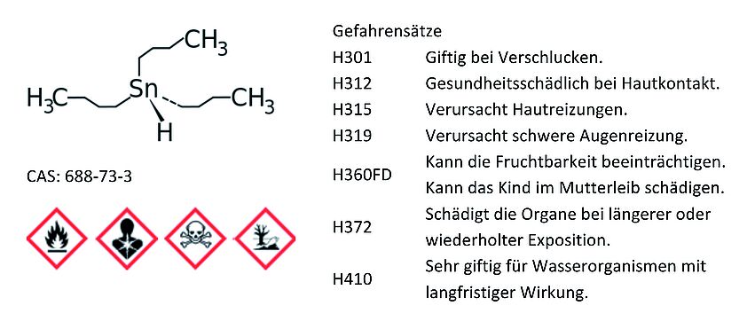 Beispielhaft für die Wirksamkeit von Bioziden soll hier vertieft auf Tributylzinnverbindungen eingegangen werden. Biozide werden entwickelt, um Schädlinge zu töten. Um effektiv zu wirken, greifen sie gezielt in lebensnotwendige Mechanismen ein, wie die Steuerung des Hormon- oder Nervensystems. Dies sind in der Regel für das Leben elementare und damit evolutionär gesehen uralte Systeme, die sich über die verschiedenen Arten nicht wesentlich auseinander entwickeln konnten. Daher bleibt eine Wirkung auch bei höher entwickelten Wirbel- und Säugetieren nicht aus. Obwohl das Bewusstsein dafür wächst, gibt es für wichtige toxische Wirkungen wie Hormonwirksamkeit oder den Eingriff in den Immunhaushalt in Europa keinen Kennzeichnungsformalismus. Die offizielle Kennzeichnungspflicht und Informationen aus dem Sicherheitsdatenblatt spiegeln hier also nicht den gesamten Stand des Wissens wider. Das deutsche Umweltbundesamt fasste in seinem Bericht TBT – Zinnorganische Verbindungen – Eine wissenschaftliche Bestandsaufnahme [2] folgende Tatsachen über TBT zusammen.