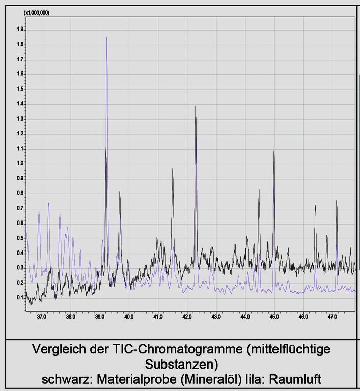 Zum Nachweis, dass es sich bei den von der Ziegelwand emittierten Substanzen um Verbindungen aus einem Mineralölprodukt handelt, wurde eine in Mineralöl getränkte Materialprobe aus einer früheren Untersuchung ebenfalls einer Headspace-Untersuchung unterzogen. Die Mineralöl-Probe zeigte genauso deutliche Übereinstimmungen mit dem Spektrum der Raumluft.