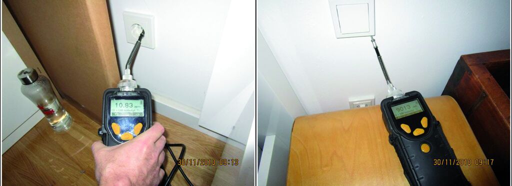 Mit einem direkt anzeigenden VOC-Orientierungsmessgerät (Photoionisationsdetektor) konnte bereits vor Ort erkannt werden, dass die höchsten VOC-Konzentrationen an Durchbrüchen der Vorsatzschalen (z. B. bei Steckdosen und Lichtschaltern) an der östlichen Schlafzimmerwand vorlagen. Die VOC-Konzentration lag beispielsweise an der Steckdose und im Bereich des Lichtschalters beim etwa 9–10 fachen von üblichen Innenraumkonzentrationen. Zum Vergleich: Typische VOC-Konzentrationen in unbelasteten Innenräumen liegen deutlich unterhalb von 1 ppm.