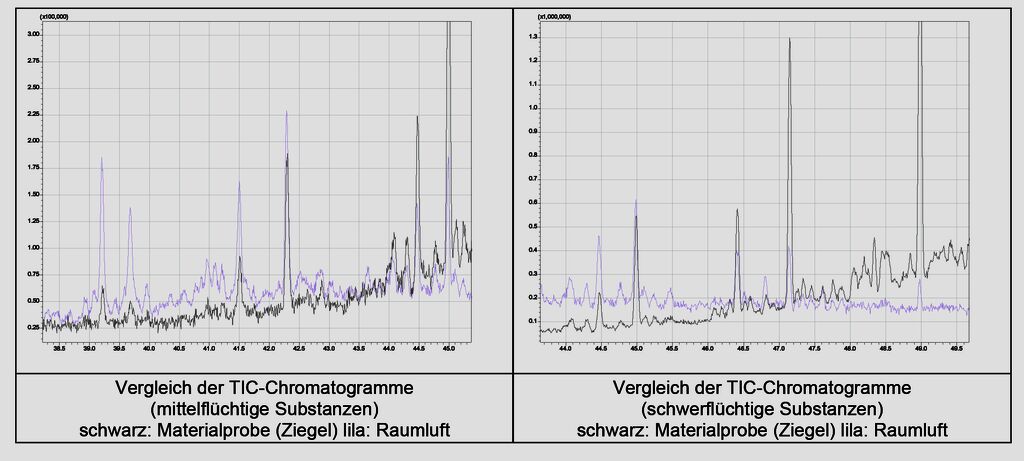Wie bereits vermutet wurde, führte die sensorische Geruchsprüfung der entnommenen Ziegelprobe zum selben Ergebnis wie die Geruchsprüfung der Raumluft. Die chemische Untersuchung der Materialprobe wurde mittels Headspace-Technik durchgeführt, bei der die von der Probe emittierten flüchtigen organischen Substanzen aus dem Gasraum des Probengefäßes direkt in einen Gaschromatographen mit gekoppelten Massenspektrometer (GC-MS) injiziert wurden. Auf diese Weise konnte das VOC-Spektrum der Raumluft mit dem charakteristischen Spektrum der Materialprobe verglichen werden. Die Gegenüberstellung beider Spektren zeigte deutliche Übereinstimmungen im mittel- bis schwerflüchtigen Siedepunktbereich.