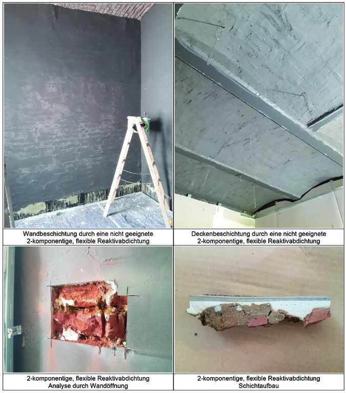 Im März 2020, etwa ein Jahr später, waren erste Sanierungsmaßnahmen umgesetzt. Entgegen des Vorschlags wurden die betroffenen Wände lediglich beschichtet. Laut technischem Merkblatt wurde eine 2-komponentige, flexible Reaktivabdichtung für Kellerwände, Fundamente und Betonbauteile gegen Bodenfeuchtigkeit, aufstauendes Sickerwasser und drückendes Wasser verwendet. Weiters war der Dokumentation zu entnehmen, dass das Produkt wasserdampf-diffusionsfähig ist. Der Auftraggeberin wurde vom Sanierungsunternehmen schriftlich zugesichert, dass dieses Produkt für den Anwendungsfall geeignet und genauso effizient wie die von uns empfohlene aluminium-kaschierte Tapete ist.