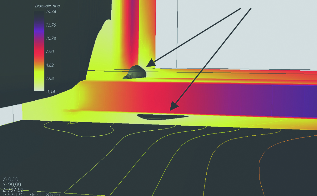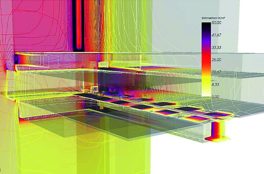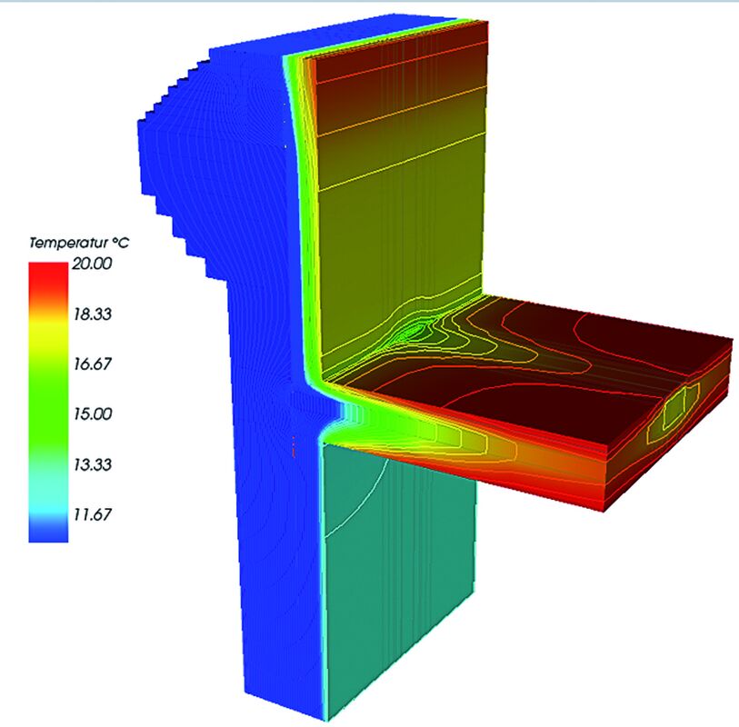 Für ausgewählte bautechnische Details konnten epochenbezogen Empfehlungen ausgesprochen werden. Zur thermischen Optimierung und bauphysikalischen Nachweisführung von Anschluss- und Konstruktionsdetails wurden u.a. 2- und 3-dimensionale Wärmebrückenberechnungen durchgeführt. Ein im Außenmauerwerk aufliegender Stahl-Unterzug unter einer Wohnungstrennwand, bei dem auf der einen Seite eine Dippelbaumdecke und auf der anderen Seite eine neue Stahlbetondecke anschließt. Ein auf einer Dippelbaumdecke aufliegender Stahlträger und dessen thermische Untersuchung zur Beurteilung des Risikos von Kondensat an der Oberfläche und in der Konstruktion zeigt Abb. 3–5 (Projekt Goldschlagstraße, Wien). Vorgehensweise und Beurteilungskriterien der Nachweisführung können auf ähnliche, in der Regel einfachere Detailausbildungen übertragen werden.