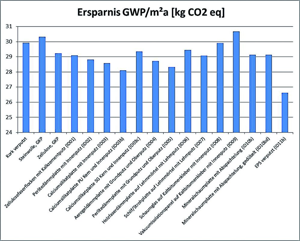 Als Highlight der Ergebnisse kann der im Rahmen des Projekts für die Anforderungen der Sanierung mit Innendämmung weiterentwickelte ökonomisch- ökologische Amortisationsrechner gesehen werden. Hierbei wurden nicht nur aktuelle Kostenkennwerte erfasst, sondern auch ein Postprocessing zur anwendungsorientierten Darstellung entwickelt. Die Ausgabe der ökologischen wie auch der ökonomischen Amortisationsdauer stellt dabei ebenso eine Neuheit dar wie eine auf U-Wert bezogene Gegenüberstellung der Varianten (Abb. 6 und Abb. 7), hier für einen U-Wert der Gesamtkonstruktion von 0,35 W/m²K, bei einem U-Wert der Bestandskonstruktion von 1,5 W/m²K und Standort Wien). Für die Innendämm-Systeme wurden die Kosten hierfür in fixe und variable Kosten aufgeteilt, um diese in Abhängigkeit der Dämmstoffstärke darstellen zu können.