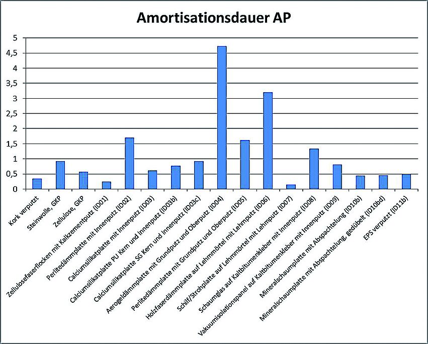 Mit dem Amortisationsrechner ist auch ein direkter Vergleich zweier Innendämm-Systeme und/oder Energieträger für Dämmstärken von 0 bis 20 cm möglich. Ökonomische Indikatoren – wie Amortisationsdauer oder Annuitätischer Gewinn – und Umweltindikatoren – wie Primärenergieinhalt (PE), der Beitrag zur Globalen Erwärmung bzw. Treibhauspotenzial (GWP), Versauerungspotential von Boden und Wasser (AP) – können ausgewertet und dargestellt werden.