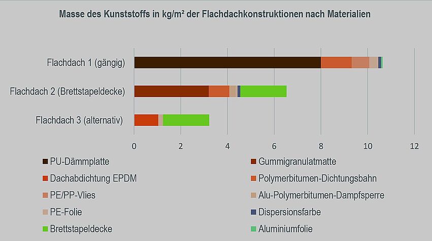 Auch wenn die Konstruktionsweise an sich nicht geändert werden kann oder soll, sind Optimierungen in Bezug auf den Kunststoffanteil möglich. Dies zeigt Abbildung 3, wo die Variante der mit Kork gedämmten Brettstapeldecke, abgedichtet mit einer EPDM-Folie mit einem Kunststoffgehalt von 3,22 kg/m2 im Gegensatz zu einem gängigen Flachdachaufbau mit Stahlbeton, Polymerbitumenabdichtung und PU-Dämmung 7 kg weniger Kunststoffe pro m² enthält. Das ist eine Einsparung von 69 M%.