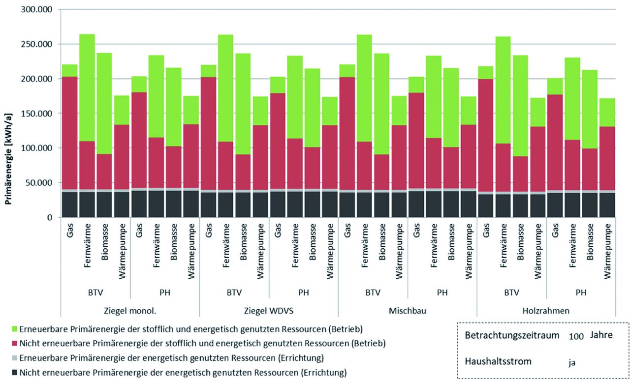 Die Abbildung 3 zeigt im linken Teil die Varianten mit einem Energieniveau, welches die gesetzlichen Mindestanforderungen in Vorarlberg erfüllt (BTV) und im rechten Teil die Varianten, welche den Passivhausstandard (PH) erfüllen. Es wird für diese beiden Energieniveaus deutlich, dass für jeden Wärmeerzeuger getrennt betrachtet, der Primärenergieverbrauch der Mindestanforderungen (BTV) im Durchschnitt ca. 10.000 kWh/a höher ist als der der Passivhausvarianten. Das Argument, dass z.B. eine erhöhte Wärmedämmung in der Herstellung viel mehr Energie „verbraucht“ als sie im Betrieb „einspart“, kann durch eine gemeinsame Energiebilanz für Betrieb und Errichtung für den Faktor Primärenergie daher entkräftet werden. Wird der Betrachtungszeitraum mit 30 Jahren definiert und nur die Herstellung der Baustoffe ohne Erneuerungszyklen berücksichtigt, verdoppelt sich der Anteil des Primärenergieverbrauchs bei der Errichtung im Vergleich zu einem Betrachtungszeitraum von 100 Jahren (inkl. Erneuerung der Baustoffe). Neben dem Betrachtungszeitraum können auch die anderen Rahmenbedingungen (Berücksichtigung des Haushaltsstromes, betrachteter Indikator, Konversionsfaktoren) die Ergebnisse teilweise deutlich beeinflussen.