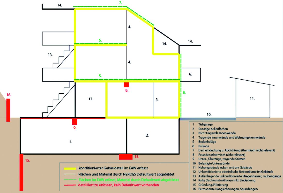 Ein weiteres Projektziel war, für bisher nicht im Energieausweis erfasste Gebäudeteile und Haustechniksysteme eine vereinfachte und dadurch zeitsparende Eingabemöglichkeit zu bieten. Die Berechnungsleitfäden wurden so entwickelt, dass durch die Eingabe bereits im Planungsprozess vorhandener Gebäude- bzw. Bauteilinformationeneine abschätzende Sachbilanz auch für Haustechniksysteme und nicht im Energieausweis erfasste Gebäudeteile erstellt werden kann. Aus diesen Sach- bzw. Massebilanzen können dann die Ökobilanz-Indikatoren berechnet werden. Die Eingabegrößen der Defaultwerte sollen ergebnisrelevant sein und eine Optimierung der Gebäude unterstützen. Die Defaultwerte sollen einen Gebäudeteil eher konservativ beschreiben, d.h. wenn ein Gebäudeteil detailliert erfasst und bilanziert wird, soll das Ergebnis tendenziell ökologisch besser sein als das Ergebnis mit den Defaultwerten. Die in HEROES erarbeiteten Defaultwerte für Bauteile sind in Abbildung 2 dargestellt.