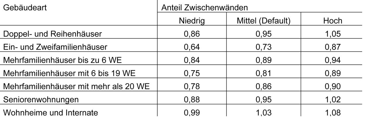 Nachfolgend wird diese vereinfachte Erfassung beispielhaft für Innenwände beschrieben. In einer detaillierten Ökobilanz werden die Flächen und die Bauteilaufbauten der verschiedenen Innenwände benötigt. Für die vereinfachte Eingabe wurde ein statistischer, geometrischerZusammenhang der Innenwandflächen zur Bruttogrundfläche für Wohngebäude in Abhängigkeit vom Gebäudetyp aus der Literatur ermittelt [BKI 2015] und angepasst. Somit kann aus der Bruttogrundfläche die Innenwandfläche ermittelt werden. Dieser Zusammenhang ist in Tabelle 2 dargestellt. Für eine vereinfachte Berechnung von Defautwerten genügen somit nachfolgende Eingaben: