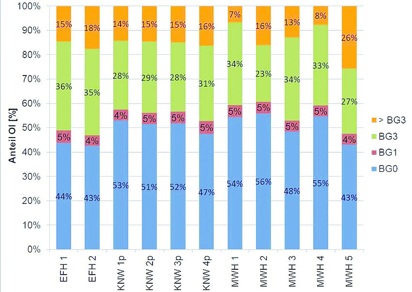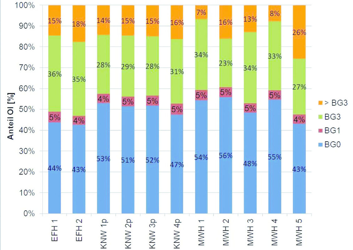Abbildung 1 zeigt den Anteil der derzeit im Rahmen der OI-Berechnung angewendeten Bilanzgrenzen (BG0, BG1 und BG3) und jene Anteile, die bisher aufgrund des hohen Aufwandes für die Erfassung in keinem gängigen Gebäudebewertungssystem erfasst werden. Werden nur die thermisch relevanten Bauteilschichten berücksichtigt (BG0), werden im Mittel 50 % des Gesamtaufwandes erfasst. Werden auch Schichten berücksichtigt, die keinen oder einen untergeordneten Einfluss auf die energetische Qualität der energieausweisrelevanten Bauteile haben (BG1), liegt der Anteil im Mittel bei 54 %. Werden zusätzlich Innenwände, Keller und Tiefgaragen berücksichtigt (BG3) steigt der Anteil des erfassten ökologischen Aufwandes am Gesamtaufwand auf im Mittel 85 %. Beim Mehrfamilienhaus MWH5, das kein innenliegendes Stiegenhaus, sondern eine außenliegende Laubengangerschließung hat, liegt der Anteil der auch in der BG3 nicht berücksichtigten Gebäudeteile sogar bei 26 % des Gesamtaufwandes.